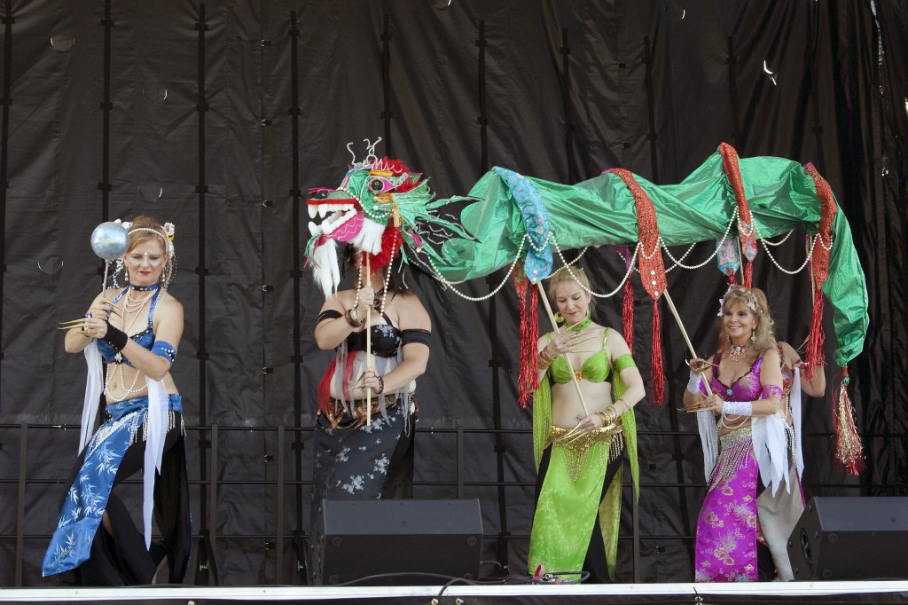 This group performed at a Denver festival and claimed it was paying homage to Chinese dragon dancing at the same time it was performing a Middle Eastern belly dance. Photo by Gil Asakawa