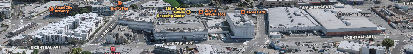 This Apple Maps image shows Tokyo Villa, on the far left, with the current site of Los Angeles Cold Storage, where the Fourth & Central development would be built if approved, on the far right.