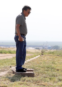 Floyd Shimomura stands on the foundation of a barrack at Amache