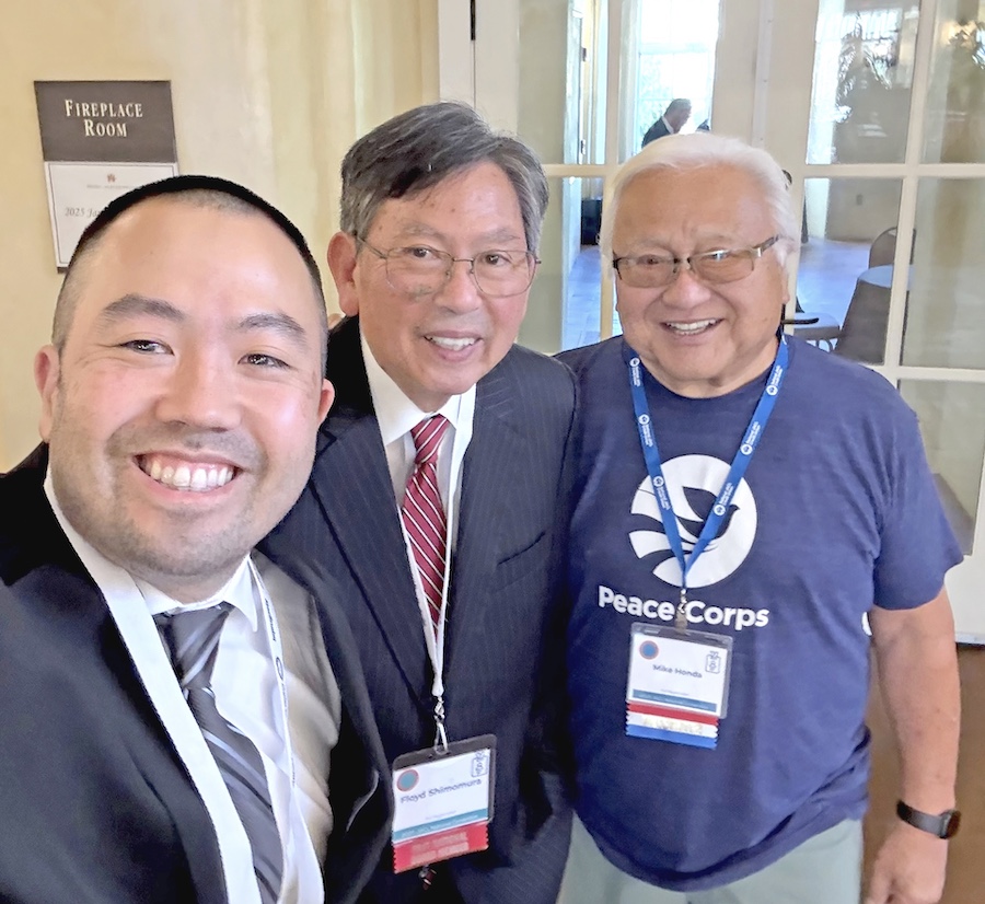 Brian Shimomura, Floyd Shimomura and Mike Honda (right) meet at the 2025 JACL National Convention.