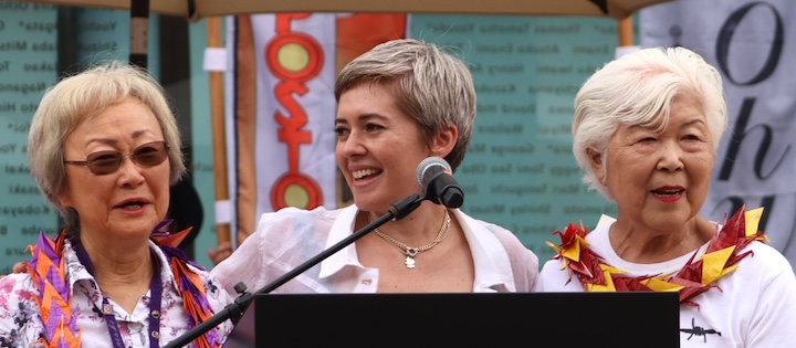The event was not all fire and brimstone. Heatherton introduced Jeanette Fujita Konishi and said, “Today is her 80th birthday. There are lots of places she could be today. And she said she needed to be here.” More than 500 voices joined to sing “Happy Birthday” for her. The voices would soon join again as some of the speakers led protest chants.
