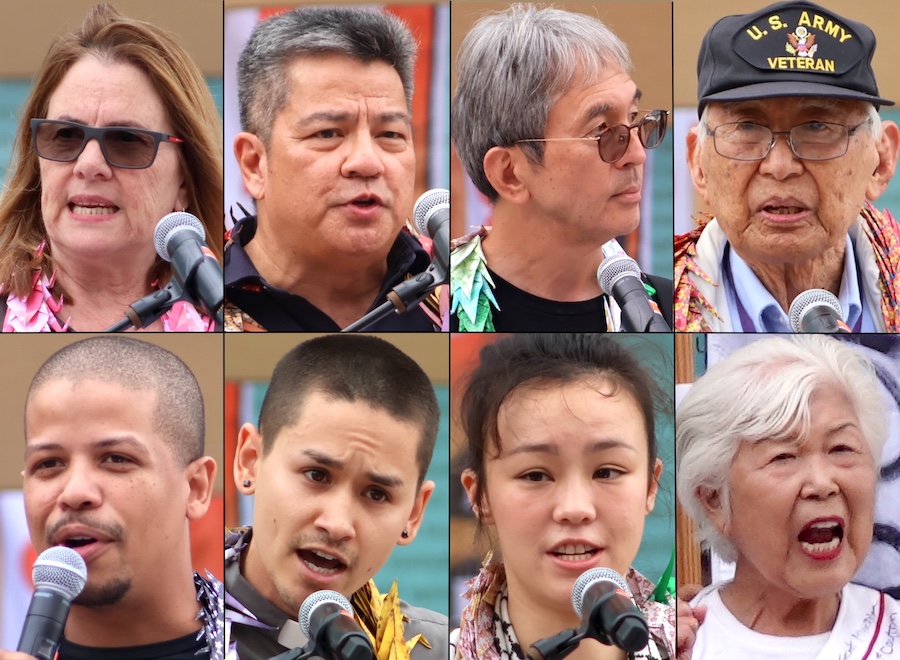 Pictured speakers from the Los Angeles Day of Action (clockwise from upper left) are Ann Burroughs, Dennis Arguelles, Glen Kitayama, Tak Hoshizaki, Kyoko Oda, Abigail Chun, Rev. Yoshi Kuramoto and Vlad Carrasco. (Photos: George Toshio Johnston)