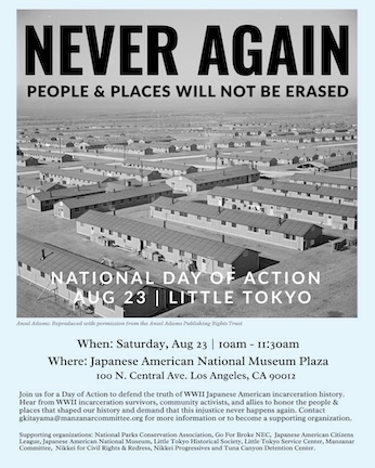 Several Japanese American organizations, including JACL, gathered at four separate sites on Aug. 23 — Little Tokyo, Seattle, Manzanar National Historic Site and Tule Lake National Monument — and on Aug. 25 at the Rosie the Riveter/WWII Home Front National Historical Park in Richmond, Calif., to speak out against the decree, titled “Restoring Truth and Sanity to American History.”