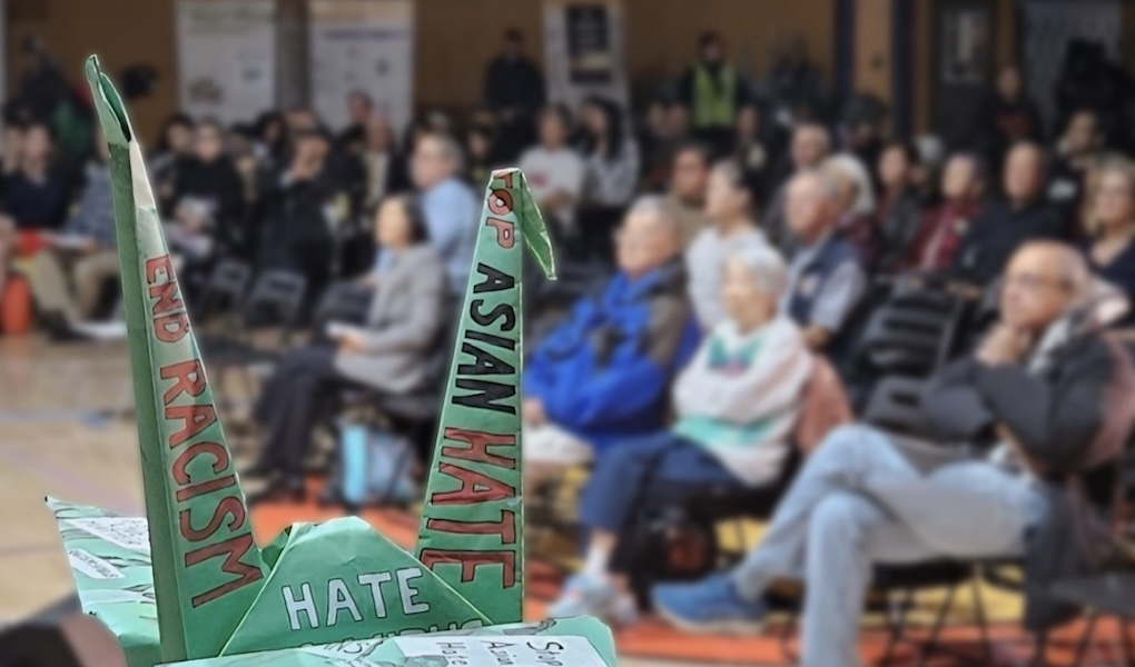 A folded crane with the words “End Racism” and “Stop Asian Hate” on display during the S.F. DOR observance event…