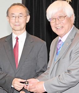 David Lin, left, receives JACL’s sapphire Pin from Larry Oda at the 2024 JACL National Convention in Philadelphia. (Photo: Kris Ikejiri)