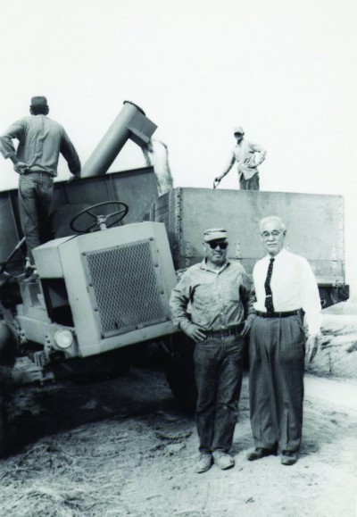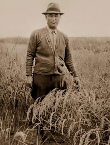Keisaburo inspects the harvesting of mature rice, circa the late 1950’s. Photo courtesy of Koda Farms