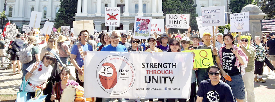 “No Kings” demonstrations were held across the country on March 28, with attendees rallying against President Trump’s policies, the rising cost of living in the U.S. and the current war with Iran. Throughout the day, crowds gathered to march, sing and wave flags in major cities throughout the U.S. Among them were several JACL chapters, including Florin-Sacramento Valley and Mount Olympus.