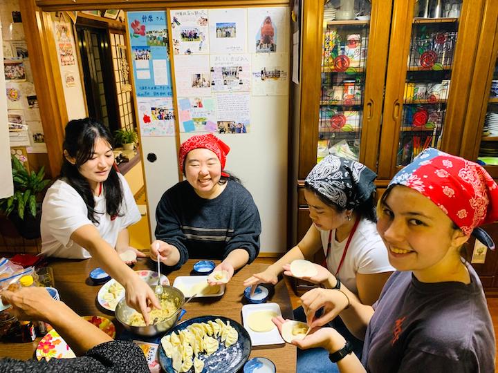 Making gyoza during their homestay are (from left) Nanami Lillie, Megan Arakaki, Jillian Stineman and Stella Saame.