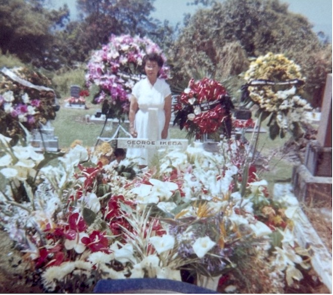His mother (Nicole Saito’s great-grandmother), Sueno Ikeda stands at his grave, sometime after 1948 following the return of his body back to Hawaii.
