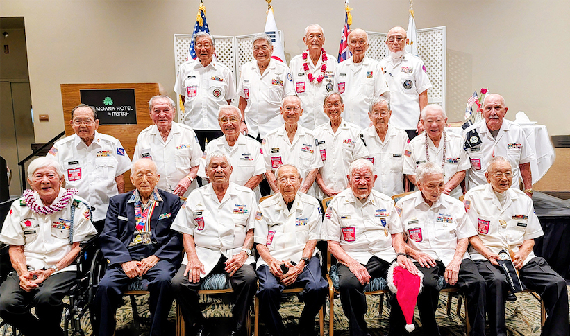 Members of the KWVA Hawaii Chapter No. 1 and guests take a group photo at their 2025 Christmas Luncheon at the Ala Moana Hotel in Honolulu. Pictured (front row, from left) are Stanley Nakasone, Alfred Kim, Robert Kaleohano, Stanley Fujii, Kenneth Tashiro, Tommy Tahara and Franklin Chang; (middle row, from left) Herbert Iwashita, Susumu Agena, Harold Yamauchi, Richard Poe, Brian Lau, Kenneth Muraoka, Nori Uyematsu and Clifford Chillingworth; and (back row, from left) Roy Yamashiroya, Walter Furuyama, Bob Imose, Herbert Kobayashi and Walter Ozawa. Photos: Patti Hirahara