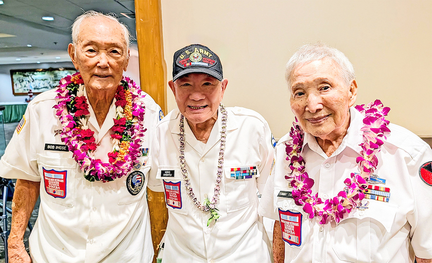 When Korean War veteran Nori Uyematsu (center) went to Hawaii last May and met with a few members of this group, no one knew who he was, but when they saw him in person, they were surprised it was Norio, the name he used when he enlisted. Due to this, the group invited him back, from the mainland, to join their Christmas party last December. Pictured (from left) are KWVA Hawaii Chapter No. 1 President Robert Imose, Uyematsu and Christmas Party Chairman and Chapter Treasurer Tommy Tahara.