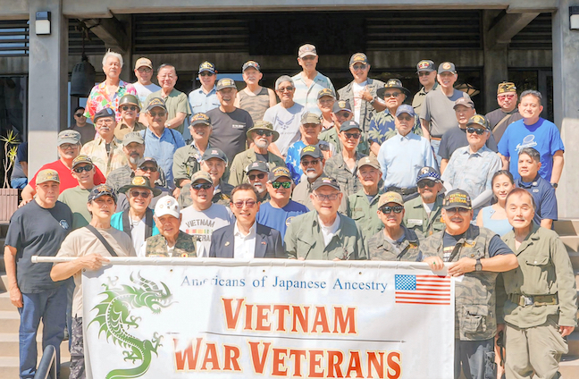 Pictured (from left) are: Front row: Terry Weber (Navy), Vietnam; Wally Takata (Army), Korean War; David Miyoshi (Marines), Vietnam; Ken Hayashi (Army), Vietnam; Garry Tanaka (Army), Vietnam; Chris Segawa (Army), Vietnam; Keith Kawamoto (Army), Vietnam; Row 2: Ramiro Puentes (Army), Vietnam; Ray Fukumoto (Army), Vietnam; Cory Shiozaki (Army), Vietnam; Dennis Yamamoto (Army), Vietnam; Don Nakamura (Army), Vietnam; Mayumi Kimura (Navy), post-9/11;