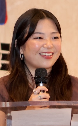 Following a vocal performance by Chase Karng was the presentation of the two K.W. Lee Spirit Awards. Speaking on behalf of Nikkei Progressives and its mission were Nina Nakao and Miya Iwataki. Nakao in her remarks said, “I really liked learning about K.W. Lee’s legacy has really shown how much that aligns.” She received huge, inadvertent laughs when she recalled how she first got involved with Nikkei Progressives during Trump’s first term, when she misspoke, saying “pregnancy” instead of “presidency.” During her turn, Iwataki praised the Center. “Your mission to train young Korean Americans to become leaders in K.W. Lee’s legacy is so crucial right now.”