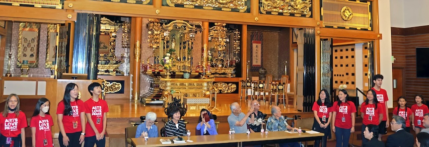 The “Peace on Your Wings” cast serenades the “Shadows for Peace: The Hiroshima & Nagasaki Experience Speaker Forum” panel on Aug. 3 at Higashi Honganji in Little Tokyo. (Photo: George Toshio Johnston)