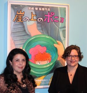 The Academy Museum of Motion Pictures Assistant Curator Emily Rauber Rodriguez (left) and Senior Exhibitions Curator Jessica Niebel stand in front of the “Ponyo” one-sheet for the Japanese market.