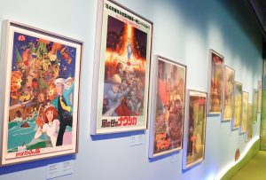 A display of movie posters for various anime movies directed by Hayao Miyazaki