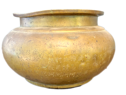 This brass vessel survived the Hiroshima bombing. Inscriptions are the names of people who donated to create this vessel.