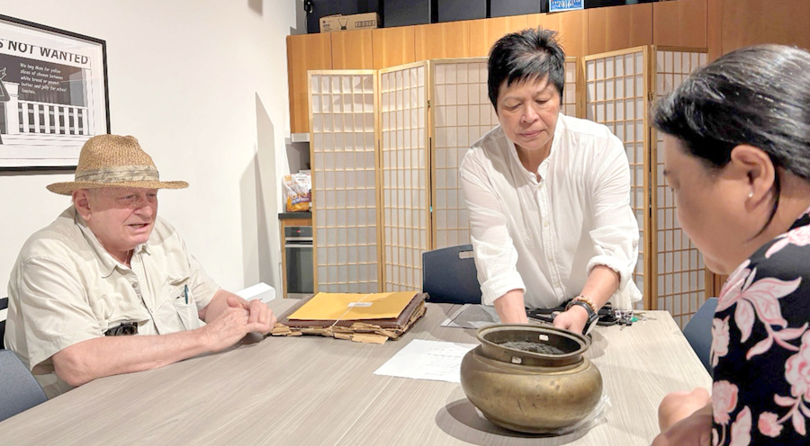 (From left) Dan Ball, Andrea Agana and Hanako Wakatsuki-Chong observe the vessel on July 23 at the Japanese American Museum of Oregon. Its next destination: returning to Hiroshima. (Photos: Courtesy of the Japanese American Museum of Oregon)
