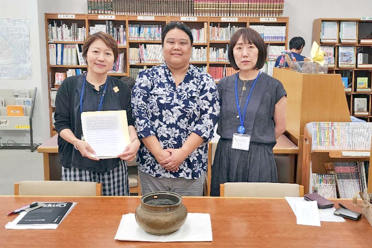(From left) Natsuki Okita, Hanako Wakatsuki-Chong and Mari Shimomura following the transfer of the brass vessel to the stewardship of the Hiroshima Peace Memorial Museum on Aug. 5 (Photos: Courtesy of JAMO)