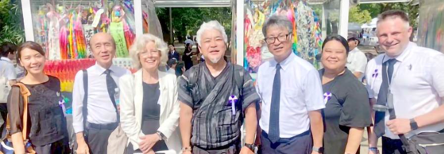 Pictured (from left) are Ched Magaspar, Masahiro Sasaki, Sue DiCicco Smith, Sumiyuki Sasaki, Yuji Sasaki, Hanako Wakatsuki-Chong and Noël Southall at at the Children’s Peace Memorial on the 80th anniversary of the bombing of Hiroshima event at Hiroshima Peace Memorial Park on Aug. 6.