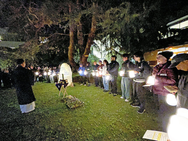 As each name was read aloud by Rev. Saito, a hand lantern was turned on by a university student or relative of the Nisei student. At the end, 20 small lanterns glowed softly in the darkness, one for each student and Asawa, who was in high school in Southern California when she was removed to Rohwer in Arkansas. Attendees offered incense and placed a flower at the foot of the lantern.