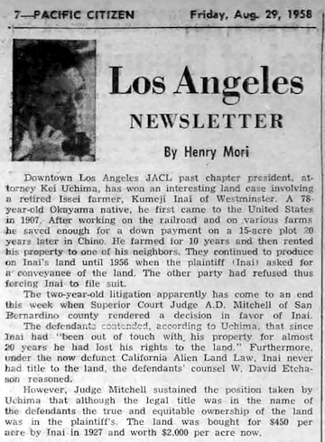 This article from the Aug. 29, 1958, issue of the Pacific Citizen summarizes a real estate lawsuit involving property owned by Kumeji Inai, father of Haruo Inai (Photo: Pacific Citizen Digital Archive)