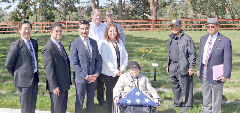 Attending Haruo Inai’s reinterment are (from left) Kurt Ikeda and Mitch Maki of Go for Broke National Education Center; Los Angeles National Cemetery Director Cuauhtemoc Meza; Brian Smith; Sasha Mori; Max Miller; Sonoe Inai; Len Pagarigan; and Cemetery Administrative Specialist Pablo Agrio. (Photo: George Toshio Johnston)