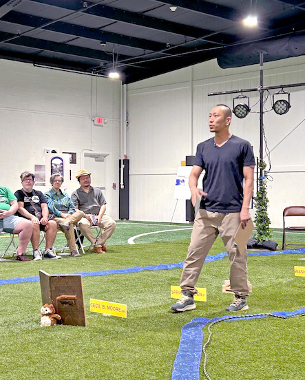 Makoto Hirano: In 2021, our pilot phase began in Bloomsburg, rural Pennsylvania. . . . We started that project without a map at all. We did a thing called snowball sampling — we met people through other participants until we had enough interviews. August of ’22 is when we did our Bloomsburg performance. We also did a performance of that same version in Philly. The rest of ’22, all of ’23 and most of ’24 — almost two years was spent designing the process for our most recent production.