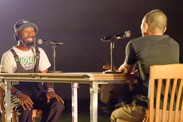 Positive Movement Drumline Founder Tony Royster sits with Makoto Hirano during a live interview sequence, before ending the show with a short drum performance.