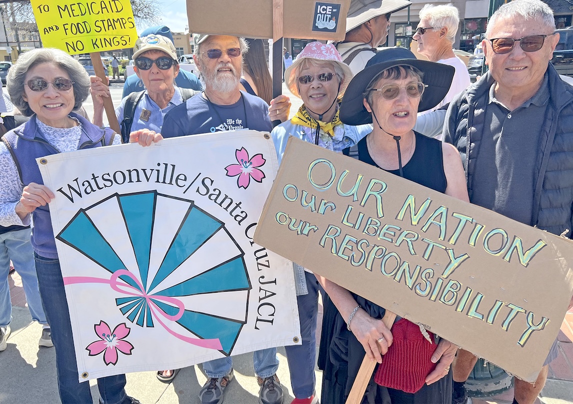 Members of the Watsonville-Santa Cruz JACL chapter attended the “No Kings Rally” on Feb. 28 at the Watsonville City Plaza. Pictured are (from left) Marcia Hashimoto, Amy Newell, Paul Kaneko, Carol Kaneko, Maria Burnett and Victor Kimura. (Photo: Courtesy of Watsonville-Santa Cruz JACL)