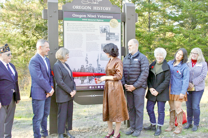Mia Ballinger (center) cuts the ribbon during the Nov. 11, 2025, dedication ceremony for a historical marker that commemorates the contributions to the World War II effort by Nisei soldiers. Ballinger’s great-grandfather served in the 422nd Regimental Combat Team. Also pictured (from left) are Commander Carl Casey (American Legion Post 22), Oregon Rep. Jeff Helfrich (District 22), Hood River County Commissioner Jennifer Euwer, Hood River Mayor Paul Blackburn, former Hood River Mayor Kate McBride, Hood River City Councilor Gladys Rivera and Lisa Commander, executive director of the History Museum of Hood River County.   Photo: Eder Campuzano